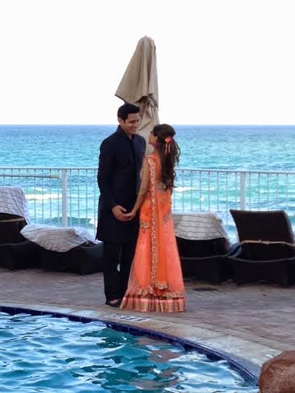 Saturday morning started with a super energetic baraat that closed down Collins Avenue (literally!). The groom arrived in a super stylish orange Lamborghini Spyder Gallardo and was escorted by police officers down collins avenue toward the Trump Resort.